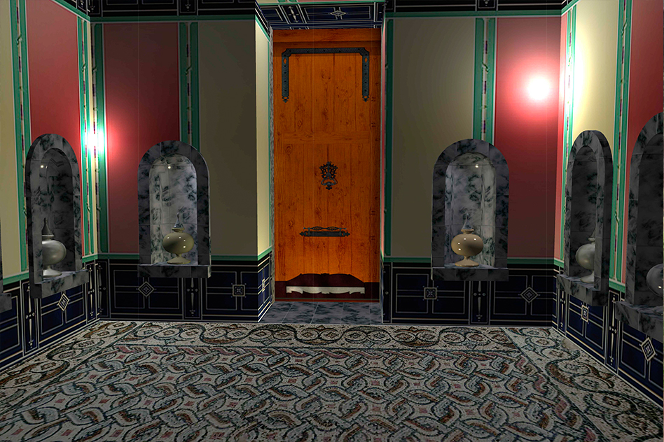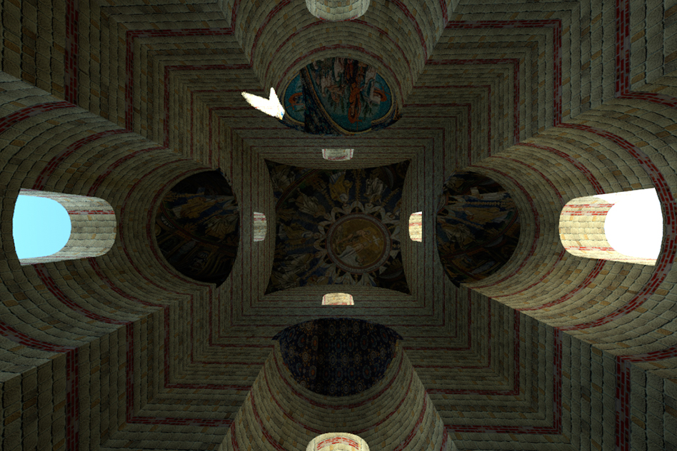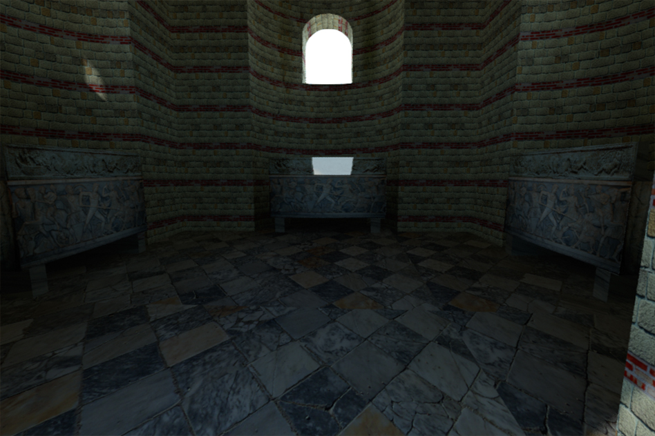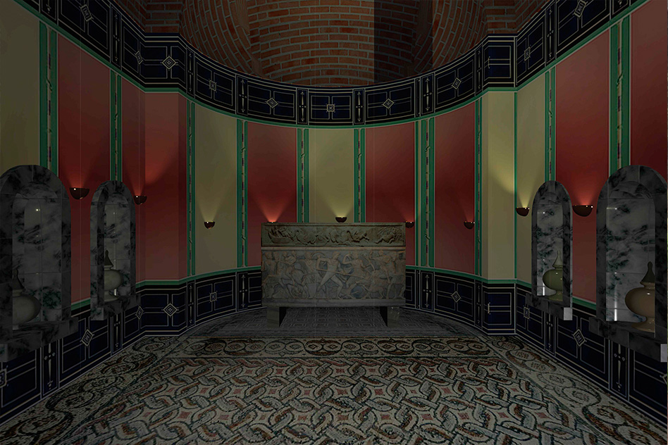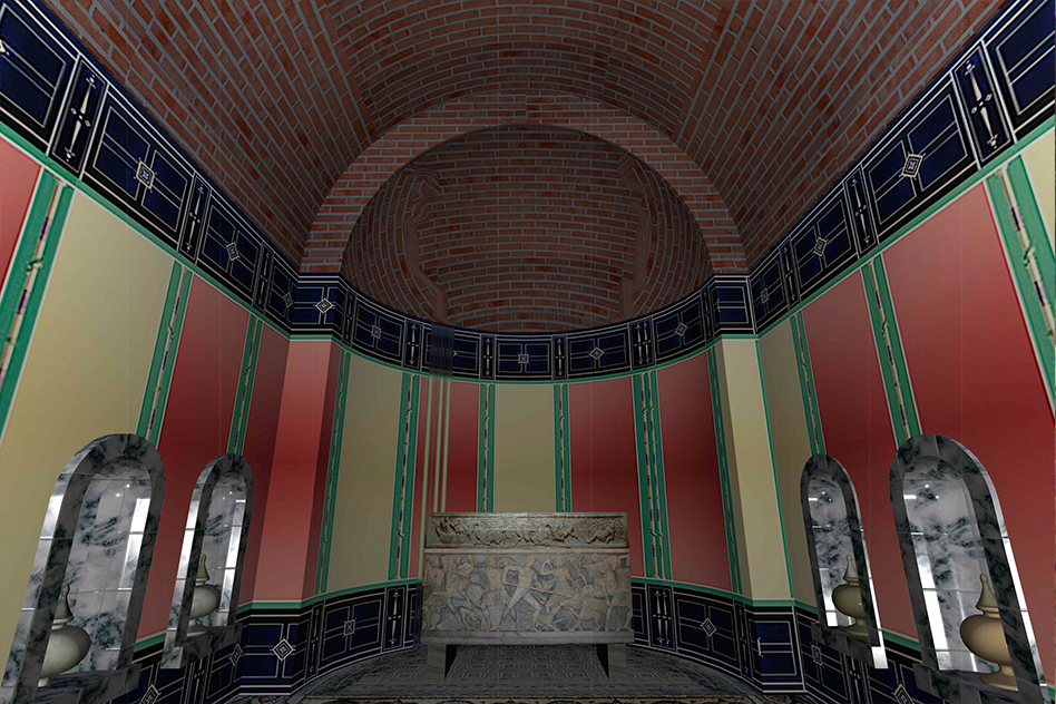 Arriba vista de las cúpulas interiores del edificio, abajo vista de los sarcofagos desde la entrada, según recontrucción ideal de esta parte del mausoleo.