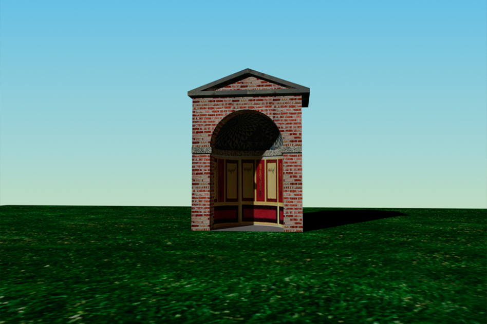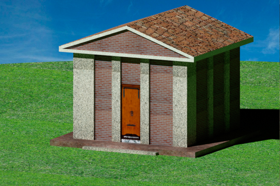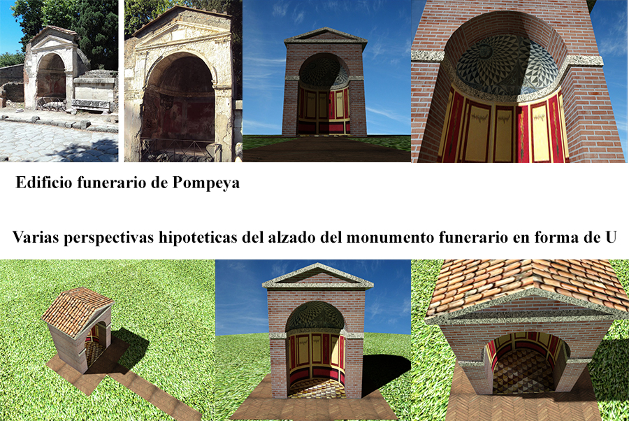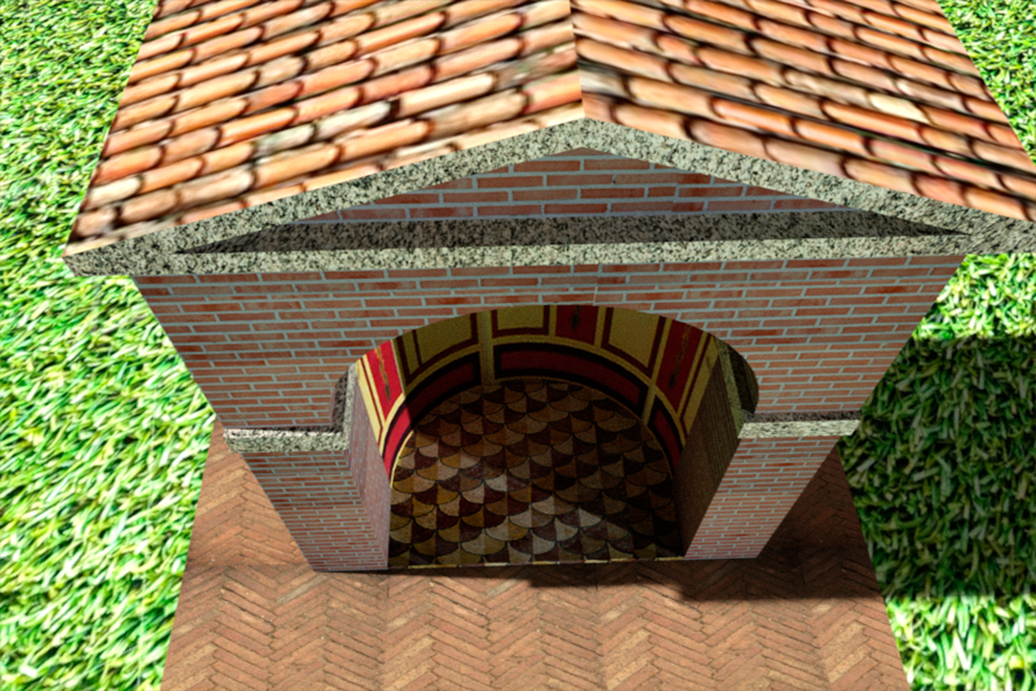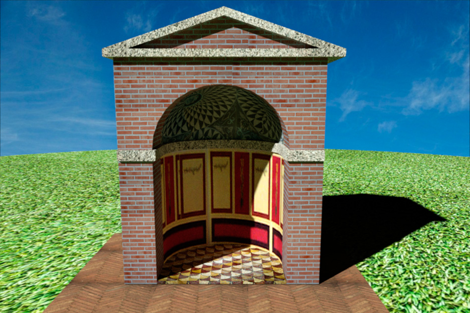Hace algunos años se realizó una excavación arqueológica en la zona, poniendo totalmente al descubierto el cimiento existente, pero no se sacó ninguna conclusión arqueológica del pequeño edificio, abandonado las excavaciones en la zona y sin dar ninguna hipótesis de que sería ese edificio. A nosotros se nos ocurre una hipótesis que tiene mucho sentido comparando la planta de este edificio con otros edificios existentes en el mundo romano, concretamente en Pompeya. Saliendo de la ciudad por la vía de Herculano en dirección a la villa de los Misterios hay una espléndida colección de monumentos funerarios y hay uno que tiene una planta casi exacta a este de Carranque, un pequeño edificio con tres paredes haciendo forma de U con ábside en el fondo y cúpula de cuarto de esfera en el ábside y arco de medio punto en el frente. Hemos realizado una reconstrucción isométrica en 3D de cómo podría ser este pequeño edifico, basándonos en este edificio funerario de Pompeya para poder ilustrar este articulo y que apoye nuestra hipótesis. Ignoramos la fecha de construcción de este edificio ya que solo se conservan los cimientos.