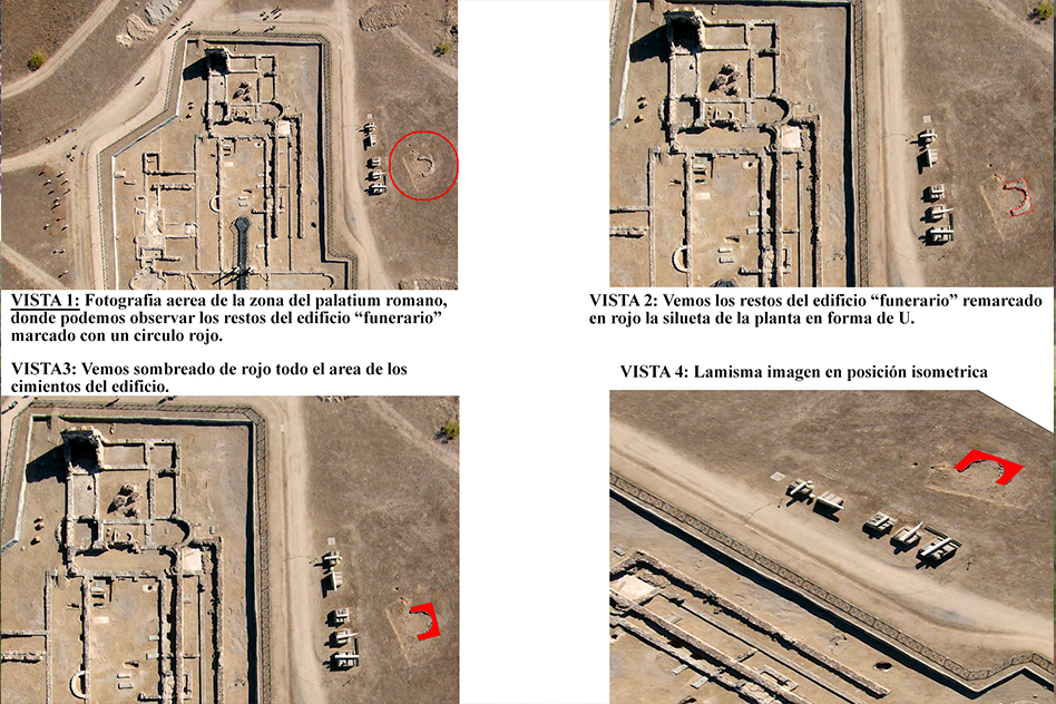 Aunque posiblemente pudo haber varios y de distintos tipos. Nosotros en este artículo, vamos a analizar los diferentes edificios excavados hasta la fecha para así poder trabajar con la hipótesis de que pudo haber hasta tres monumentos funerarios distintos y de distinta tipología. Estos tres monumentos serían, el mausoleo, el edificio cuadrilobulado incluido en el edificio palacial y unos restos de cimentaciones que aun pueden observarse al este del palatium que tienen forma de U..