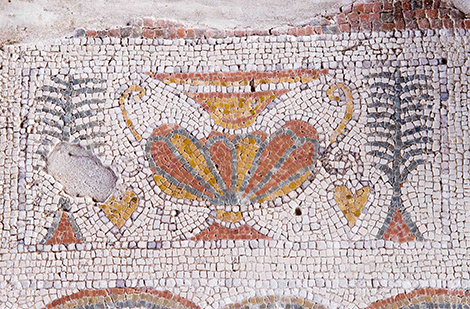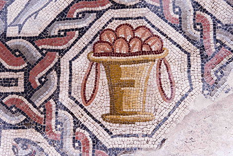 Completan el mosaico una orla alrededor del medallón central con una curiosa cenefa en 3D. Motivos geométricos con lazos de Salomón cubren el resto de la estancia. En les tres lados curvos del fondo y los laterales de la sala, se representan crateras de vino con sarmientos y hojas de parra.