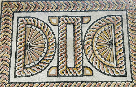 El Oecus:A la entrada del, una inscripción muestra el nombre del taller que realizó el mosaico: